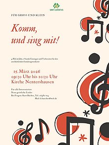 Für alle Interessierten, für Groß und Klein ... 4x im Jahr, 1 Std. Einsingen und Vorbereitung für den anschließend Familiengottesdienst 15. März 2026 09:30 - 10:30 Uhr Kirche Nentershausen