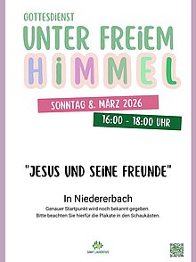 Gottesdienst "Unter freiem Himmel" 08. März 2026 16:00 - 18:00 Uhr "Jesus und seine Freunde" Niedererbach Anmeldung erforderlich!